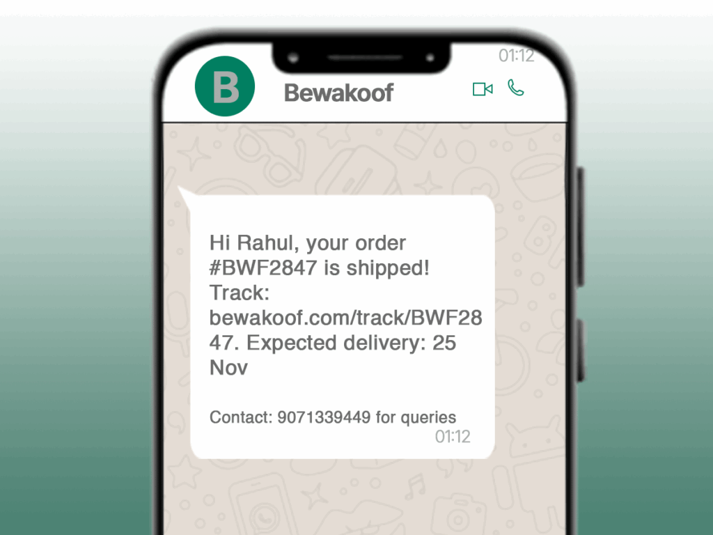 Body: Hi Rahul, your order #BWF2847 is shipped! Track: bewakoof.com/track/BWF2847. Expected delivery: 25 Nov