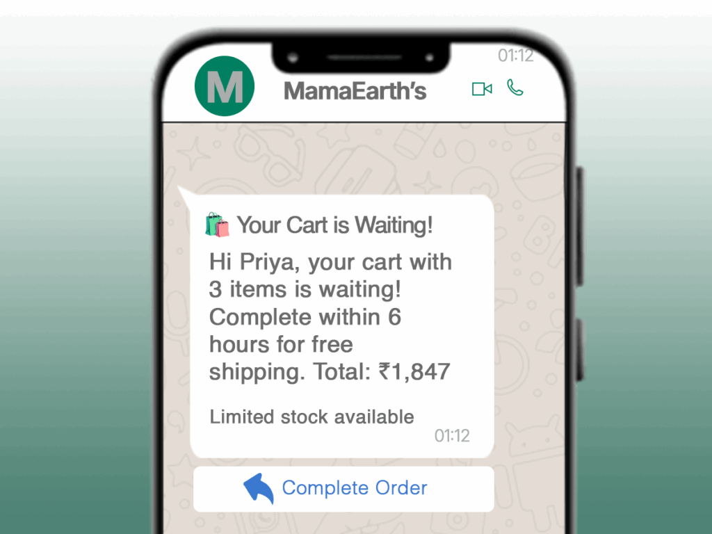 Body: Hi Priya, your cart with 3 items is waiting! Complete within 6 hours for free shipping. Total: ₹1,847